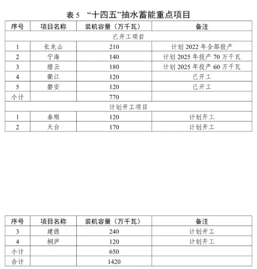 有序發(fā)展抽水蓄能電站。積極推進長龍山、寧海、縉云、衢江、磐安等抽水蓄能開工項目的建設,穩(wěn)妥開展泰順、天臺等抽水蓄能電站項目前期工作,適時啟動建德、桐廬站點的前期工作。結合現有站點,合理規(guī)劃布局,積極推動新一輪抽水蓄能電站選點工作。加強抽水蓄能電站建設管理體制、電價機制等研究。"十四五"期間,全省抽水蓄能電站力爭新增裝機容量 340 萬千瓦,累計裝機容量達到798 萬千瓦。