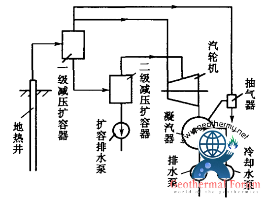 圖2是多級(jí)閃蒸(多級(jí)減壓擴(kuò)容)蒸氣循環(huán)的流程圖。從井口流出的熱水先進(jìn)入第一級(jí)減壓擴(kuò)容器,產(chǎn)生的蒸氣進(jìn)入汽輪機(jī)的高壓部分,而從第一級(jí)閃蒸器底部出來的閃蒸后的剩余熱水再進(jìn)入第二級(jí)閃蒸器(擴(kuò)容器),產(chǎn)生二次閃蒸蒸氣,并通往汽輪機(jī)低壓部分做功。若井口出來的是濕蒸氣,則直接進(jìn)入汽水分離器,蒸氣分離出來后去高壓部分做功,熱水再進(jìn)入第二級(jí)閃蒸器(減壓擴(kuò)容器),所以實(shí)際上是用一個(gè)汽水分離器代替了第一級(jí)閃蒸器,如(圖1-b)所示。第二級(jí)閃蒸器分離出來的熱水壓力若高于大氣壓力,則熱水可以自行排出;不然,就要用排水泵抽出。閃蒸器的級(jí)數(shù)增加,單位質(zhì)量工質(zhì)輸出功也增加,即地?zé)崴?/a>中的能量愈能得到充分利用。當(dāng)級(jí)數(shù)無限多時(shí),理論上可以得到最大的輸出功,增益達(dá)到極限。但是,級(jí)數(shù)增加將使設(shè)備投資增加,系統(tǒng)變得復(fù)雜,所以實(shí)際采用的閃蒸級(jí)數(shù)一般不超過四級(jí)。地?zé)崃黧w溫度高可以級(jí)數(shù)多些,熱水溫度較低時(shí)就不宜采用二級(jí)以上的閃蒸系統(tǒng)。