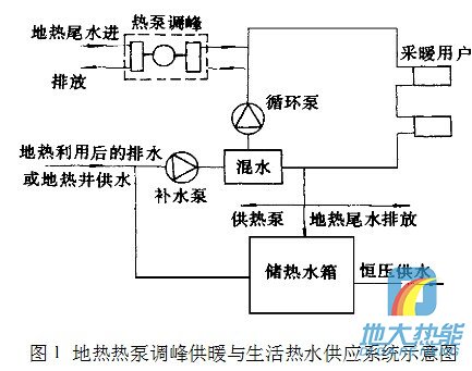 以往計(jì)算分析說明[:地?zé)?a href="http://www.mhdn.com.cn/t/熱泵供暖.html" >熱泵供暖系統(tǒng),以地?zé)峒?a href="http://www.mhdn.com.cn/t/熱泵.html" >熱泵調(diào)峰供暖方式的供暖成本和投 圖1地?zé)?a href="http://www.mhdn.com.cn/t/熱泵.html" >熱泵調(diào)峰供暖與生活熱水供應(yīng)系統(tǒng)示意圖資低于熱泵單獨(dú)作熱源的供暖方式。